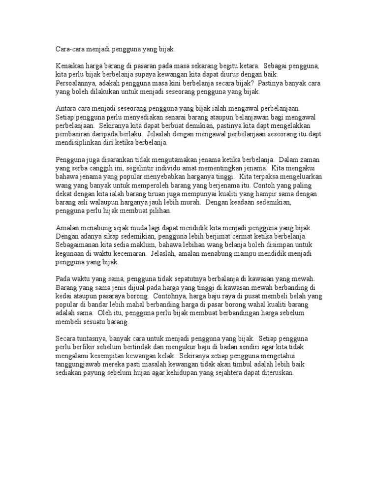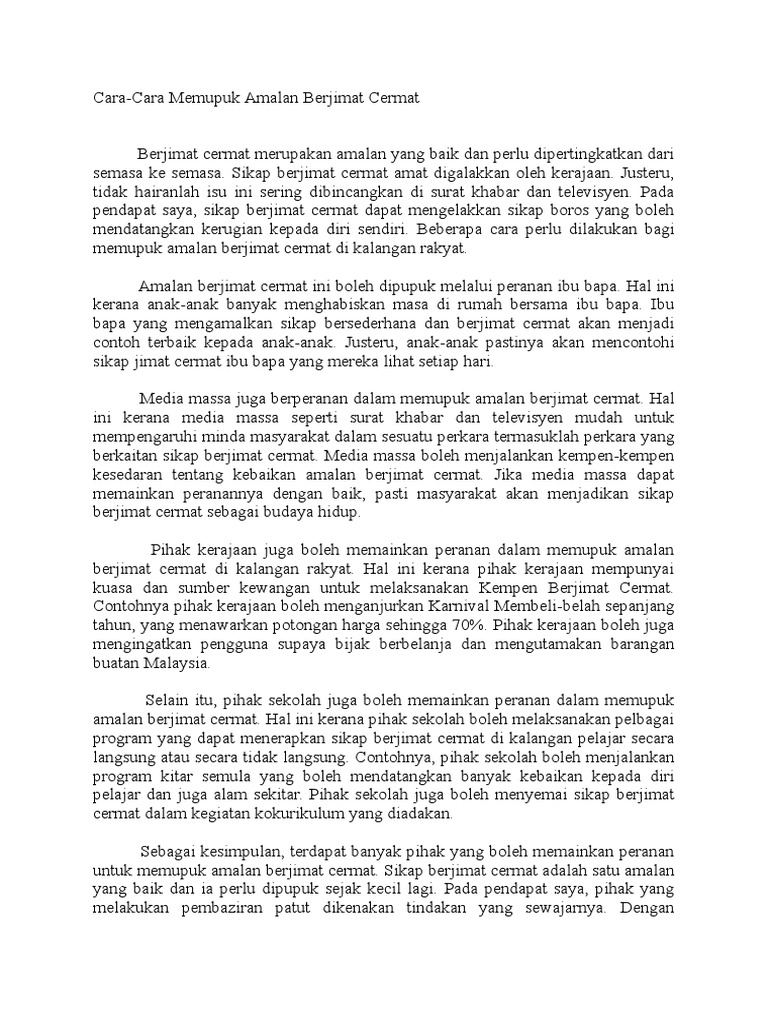Selain itu anda juga boleh memasukkan frasa-frasa menarik seperti penanda wacana dan peribahasa bagi menambah. Justeru tidak hairanlah isu ini sering dibincangkan di surat khabar dan televisyen. Berikut antara langkah-langkah untuk berjimat cermat dalam kehidupan seharian.